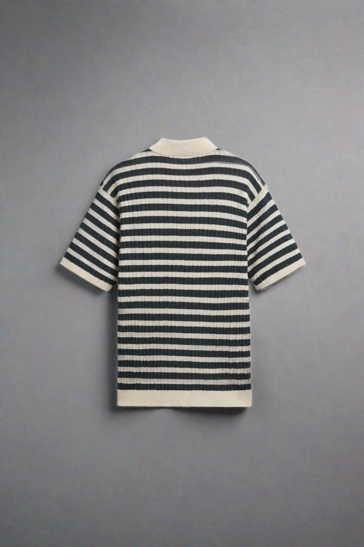 Men's Striped Ribbed Knit Polo Shirt with Short Sleeves – Cream & Navy