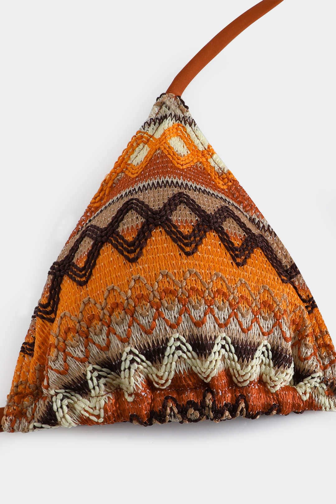 Express your bohemian side with this ethnic print triangle bikini set. Featuring vibrant patterns and adjustable tie strings, this swimwear combines free-spirited style with a customizable fit.